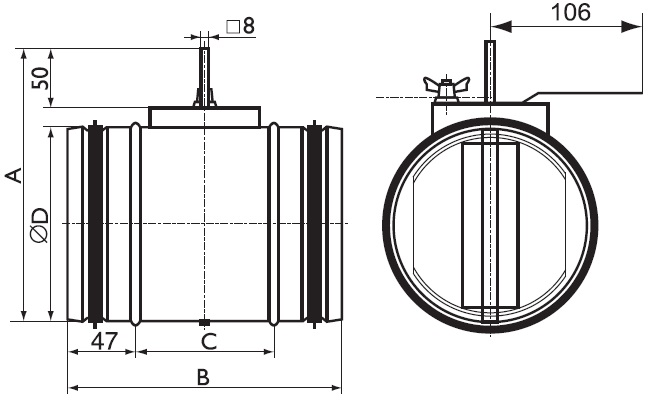 • Поворотный шток квадратного сечения со стороной 8 мм обеспечивает надежную фиксацию привода заслонки.