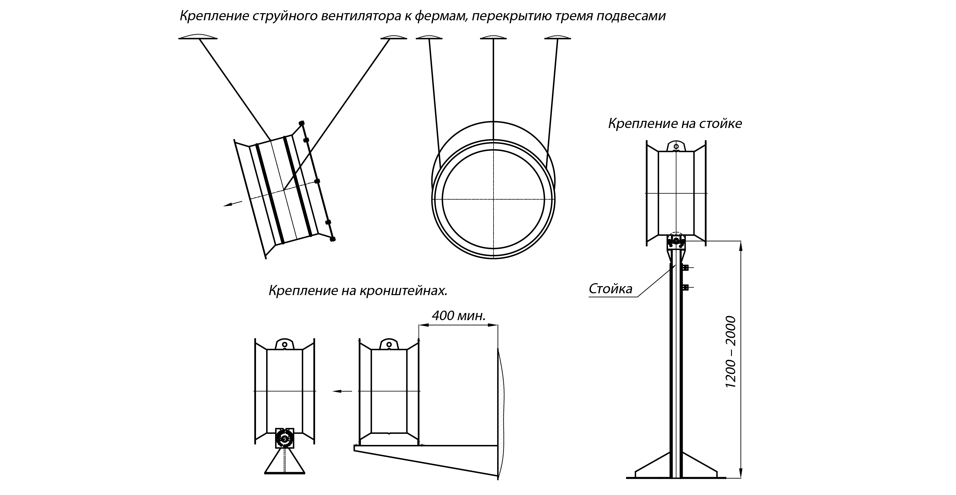 В зависимости от способа монтажа осевые вентиляторы ВС 10-400 струйные условно делятся на подвесные, напольные и настенные.